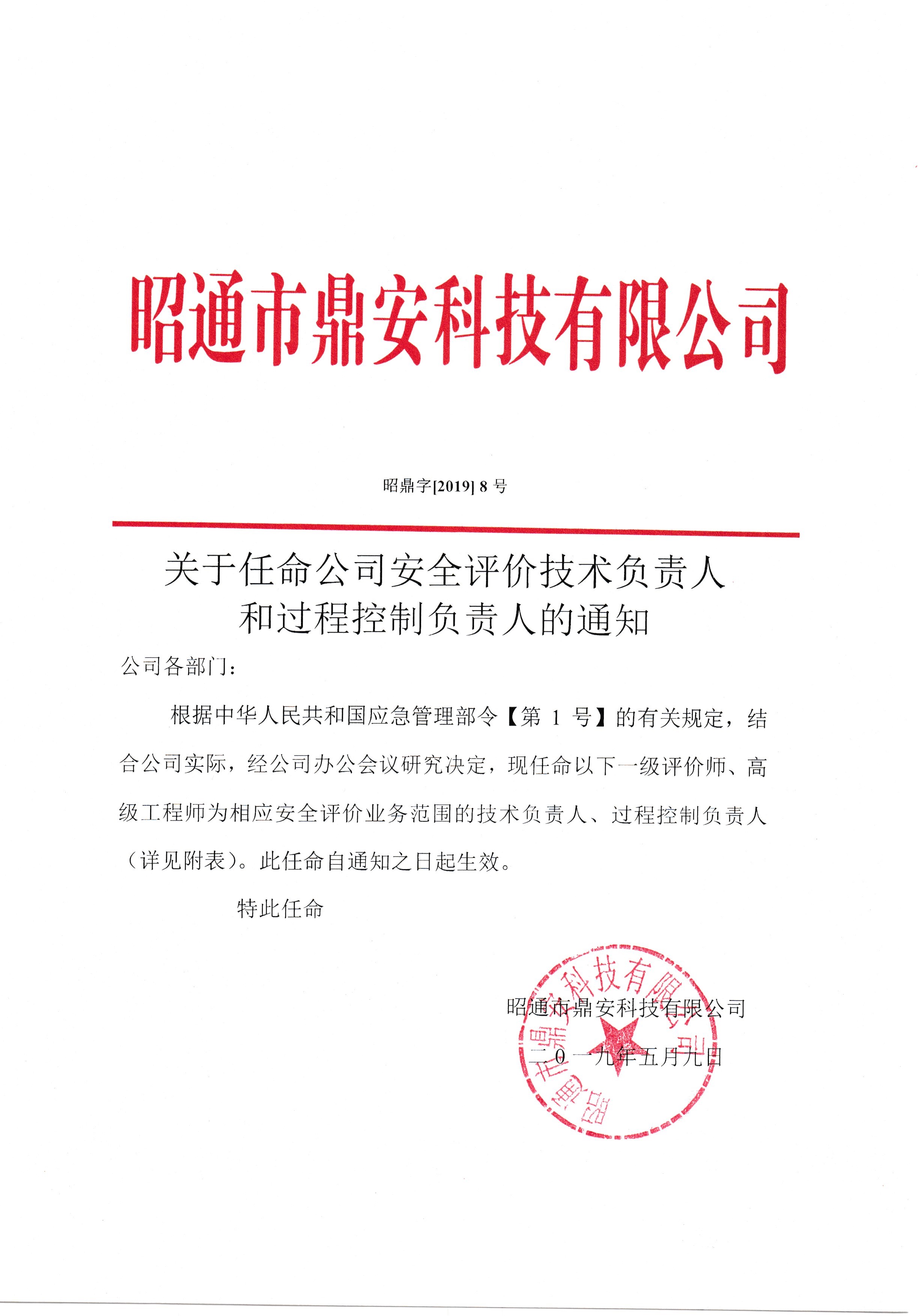 關(guān)于任命公司安全評價技術(shù)負責(zé)人和過程控制負責(zé)人的通知
